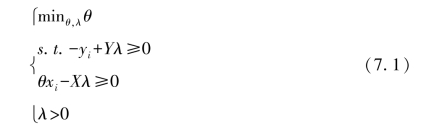 其中,xi、yi分别是第i个决策单元的投入数量和产出数量;X和Y表示n个决策单元的总投入和产出量,分别为m×n和s×n矩阵;θ表示第i个决策单元的效率值,且θ≤1。当θ的值达到1时,决策单元相对有效,即达到最优状况,处于生产前沿面上;当θ的值小于1时,决策单元位于生产前沿面之下,即没有达到最优状态,存在着效率的损失。
