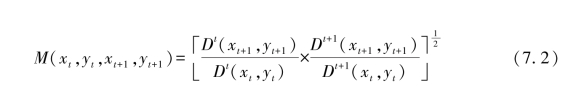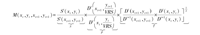 式中,第t期与第t+1期的投入产出关系分别用(xt,yt)与(xt+1,yt+1)表示;Dt+1(xt,yt)与Dt(xt+1,yt+1)是生产点在混合期与前沿上技术相比较得到的投入距离函数;Dt(xt,yt)是生产点在t时间段与前沿上技术相比较得到的投入距离函数,Dt+1(xt+1,yt+1)是生产点在t+1时间段与前沿上技术相比较得到的投入距离函数。
