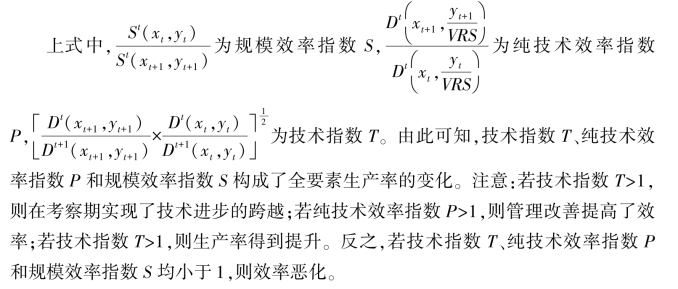 1953年,Malmquist生产指数法在消费分析过程中首次被提出,随后与DEA模型相结合广泛运用于效率测算中。因此,这里使用的Malmquist生产指数是第t期与第t+1期的集合平均数(Caves et al.,1982),具体表达式为: