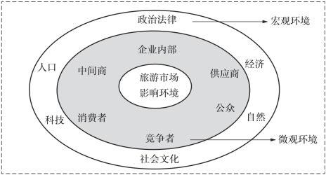 宏观环境通常指影响旅游企业营销活动的社会性力量与因素,包括人口、经济、政治法律、科学技术、社会文化及自然等。宏观环境一般以微观环境为媒介去影响和制约企业营销活动,在特定场合,也可直接影响企业的营销活动。