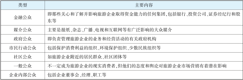 社会公众是指对企业实现其市场营销目标构成实际或潜在影响的任何组织和个人。旅游企业开展市场营销活动时,不但要针对目标市场的消费者,而且要考虑公众的心理和利益,采取各种措施与公众保持良好的关系。如表2-2所示,对于旅游企业而言,作为微观环境因素的公众主要包括金融公众、媒介公众、政府公众、市民行动公众、社区公众、一般公众以及企业内部公众等。