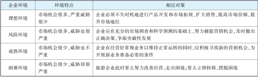由于机会与威胁对旅游企业的影响程度有大有小,不同机会和威胁可以组合成四种不同的环境类型,即理想环境、风险环境、成熟环境和困难环境。