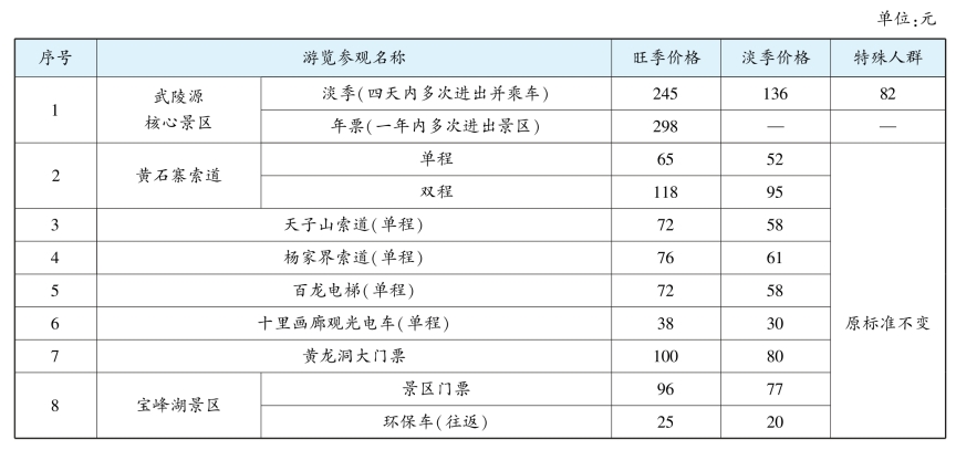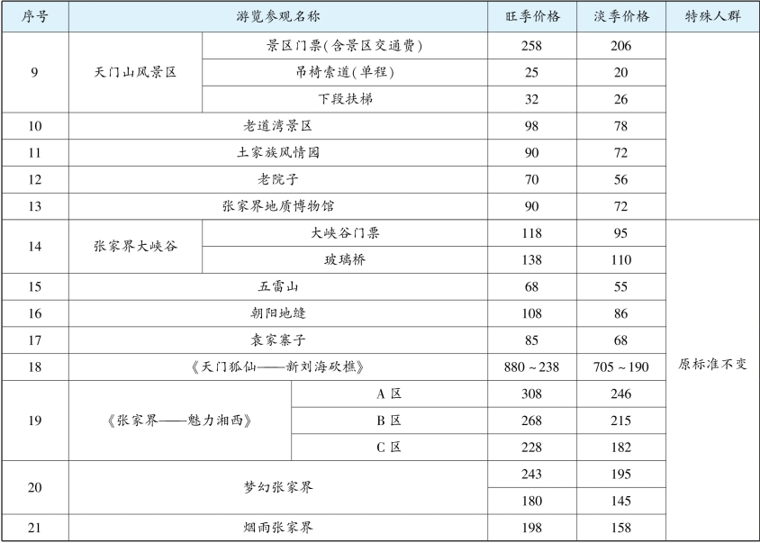 张家界市景区淡旺季门票价格表