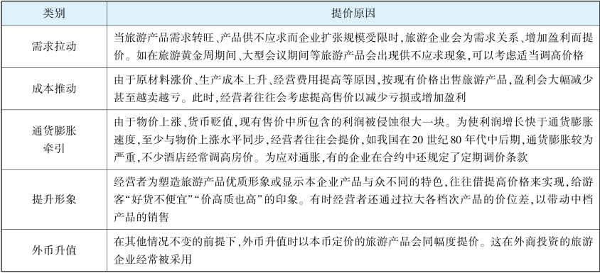 旅游企业常常会主动提高产品价格,以获取更大的经营利润,主要原因及情况如表4-4所示。