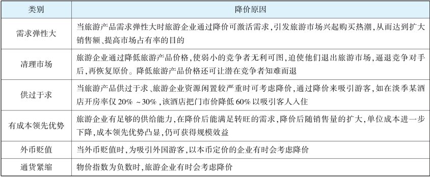 旅游企业为了实现特定的经营目标,有时会选择主动降价。在什么情况下降低旅游产品价格最有效,这是经营者首先要考虑的问题。如表4-3所示,以下原因都可能引发主动降价。