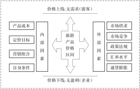 价格是一双看不见的手,它可以左右市场的供给和需求状况。旅游产品价格又具有很强的弹性,其变化的空间较一般产品大。但无论价格如何变化,其变化空间只能在消费者所能接受的最高心理价位和生产者所能接受的最低价格之间变动,不可能超过这个变化空间。旅游产品的价格取决于影响旅游产品定价的种种因素。影响旅游产品定价的因素很多,也非常复杂,一般主要分为内部因素和外部因素两个方面。