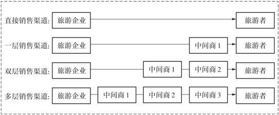 旅游产品的间接销售渠道是指旅游产品生产者或供应者通过旅游中间商将产品转移给消费者的销售途径。旅游中间商是指从事转移旅游产品的具有法人资格的经济组织和个人。采用间接销售渠道,旅游企业可以充分借助中间商的专业性和其他优势,在一定程度上有助于消除单纯采用直接销售渠道而带来的局限性。一般来讲,旅游产品的间接销售渠道,根据所经中间环节的多少,可划分为以下三种销售模式。