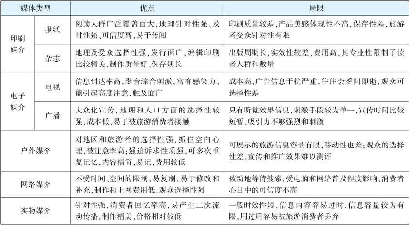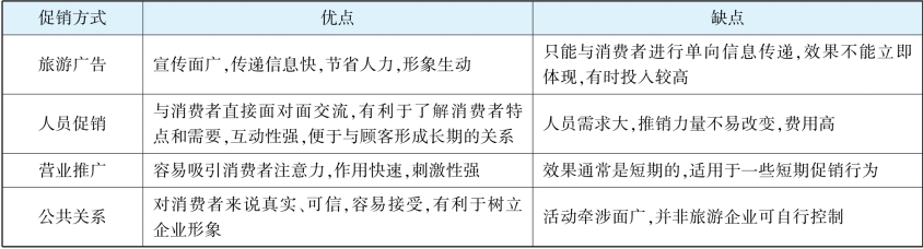 在促销中,实现旅游促销的方式和途径是多种多样的。比如说,旅游营销者可以发布各类广告信息,向潜在购买者传播与旅游产品相关的信息;或者可以开展各种营业推广活动,向潜在购买者传递短期刺激购买的有关信息;或者也可以采用各种公关手段,树立或改善旅游企业在公众心目中的形象;还可以派遣一些促销人员,面对面地与潜在购买者进行沟通交流,了解其需求,及时改进并完善旅游产品或服务,从而拓宽产品市场。