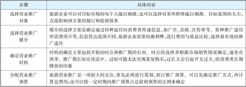 旅游营业推广,指的是旅游企业在某一特定时期与空间范围内通过刺激和鼓励交易双方,并促使旅游者尽快购买或大量购买旅游产品或服务而采取的一系列促销措施和手段,又称为销售促进。