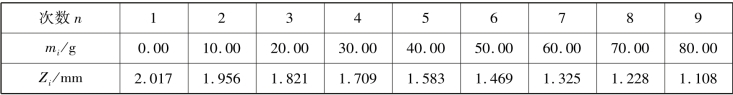 例如,用霍尔位置传感器法测量金属杨氏模量实验,测得该金属横梁中心位置Zi(mm) 读数与所加挂砝码质量mi(g) 的关系,实验数据见表1.4。 求每次载荷50 g 砝码,金属横梁中心位置的微小改变量。