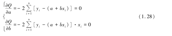 由于Q(a,b)是n 个数值的平方和,所以“使Q(a,b)最小”的原则称为最小二乘法原则(也称平方和最小原则)。 按照以上原则,用微分求极值的方法,求解二元一次联立方程: