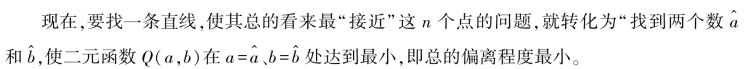 这个量反映了直线与各点之间总的偏差程度,它是随不同直线变化的,或者说是随不同的a 与b 而变化的,所以它是a、b 的二元函数,记为Q(a,b),于是: