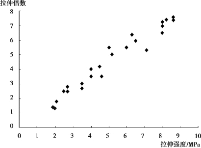 图1.2 拉伸强度与拉伸倍数散点图