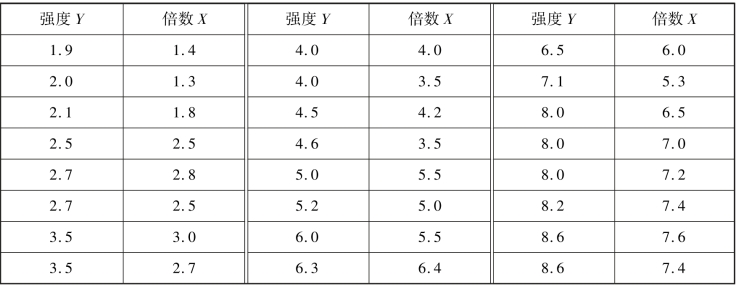 例如,某种合成材料的强度与其拉伸倍数有关,表1.7 是24 个材料试样的强度与相应的拉伸倍数的实测记录,试建立这两个变量之间的关系。