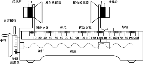 ④由于空气中的超声波衰减较大,在较长距离内测量时,接收波会有明显的衰减,这可能会带来计时器读数有跳字,这时应微调(距离增大时,顺时针调节;距离减小时,逆时针调节)接收增益,使计时器读数在移动S2 时连续准确变化。 可以将接收换能器先调到远离发射换能器的一端,并将接收增益调至最大,这时计时器有相应的读数。 由远到近调节接收换能器,这时计时器读数将变小;随着距离的变近,接收波的幅度逐渐变大,在某一位置,计时器读数如果有跳字,就逆时针微调接收增益旋钮,使计时器的计时读数连续准确变化,就可准确测得计时值。
