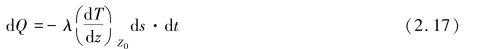 式(2.17)中的负号表示热量从高温区向低温区传导(即热传导的方向与温度梯度的方向相反)。 式中比例系数λ 即为导热系数,可见热导率的物理意义:在温度梯度为一个单位的情况下,单位时间内垂直通过单位面积截面的热量。