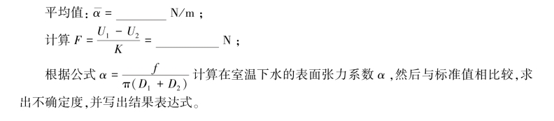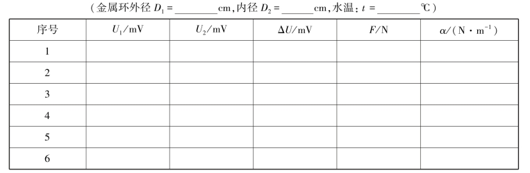 ③调节容器下的升降台,使液面渐渐上升,当吊环下沿部分全部浸没于待测液体中时,金属环片和液面间形成一环形液膜,然后改为反向调节升降台,使液面逐渐下降,观察环浸入液体中及从液体中拉起时的物理过程和现象。 特别应注意吊环即将拉断液膜前一瞬间数字电压表读数值为U1,液膜拉断后一瞬间数字电压表读数为U2。 记下这两个数值(表2.14),这时ΔU = U1 - U2。