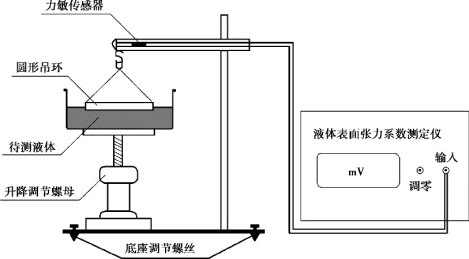 表面现象广泛见于钢铁生产、焊接、印刷和染料、复合材料的制备等过程中。 液体表面张力系数是表征液体性质的一个重要参数,研究表面现象、测量表面液体张力系数具有极其重要的意义。 测量液体表面张力系数有多种方法,如最大泡压法、毛细管法、拉脱法等。 本实验利用拉脱法测量液体的表面张力系数。 该方法的特点是,用称量仪器直接测量液体的表面张力,测量方法直观,概念清楚。 用拉脱法测量液体表面张力系数,对测量力的仪器要求较高,由于液体表面张力的大小为1×10-3 ~1×10-2N,因此需要一种灵敏度高且稳定性好的测量力的仪器。 近年来,新发展的硅压阻式力敏传感器张力测定仪正好能满足此种需要,它比传统的焦利秤、扭秤等灵敏度高,稳定性好,且可用数字输出显示,操作比较方便。 为了理解各类液体的表面张力系数,在对水进行测量以后,还可对不同浓度的酒精溶液进行测量,去观察表面张力系数随液体浓度的变化而变化的现象。