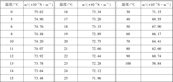 表2.16 不同温度下与空气接触的水的表面张力系数