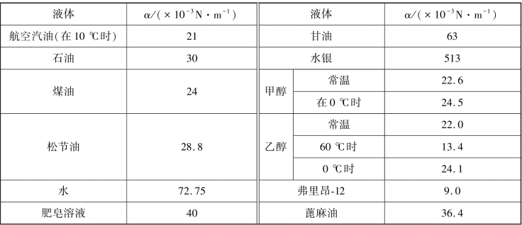 式中α 称为液体的表面张力系数,单位为N/m,在数值上等于单位长度上的表面张力。实验证明,表面张力系数的大小与液体的温度、纯度、种类和它上方的气体成分有关。 对同种液体,温度越高,其α 越小;某些杂质能使α 增大,而表面活性物质则能使α 减小。