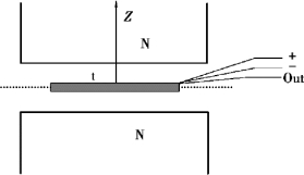 霍尔元件放在磁感强度为B 的磁场中,在垂直于磁场方向通有电流I,则与这二者垂直的方向上将产生霍尔电压UH: