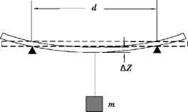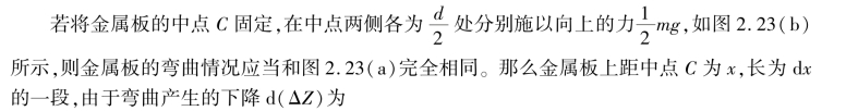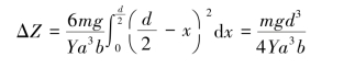 将厚为a、宽为b 的金属板放在相距为d 的二刀口上,如图2.22 所示,在金属板上二刀口的中点处挂上质量为m 的砝码,板被压弯,设挂砝码处下降ΔZ。