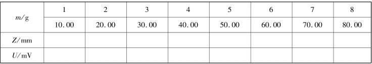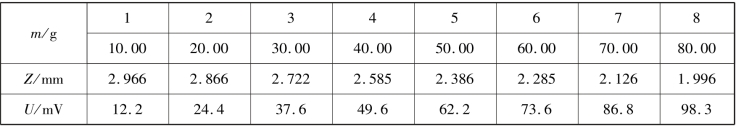 在进行测量之前,要求符合上述安装要求,并且检查金属板的水平、刀口的垂直、挂砝码的刀口处于梁中间,一切正常后加砝码,使梁产生位移ΔZ;精确测量传感器信号输出端的数值与固定砝码架的位置Z 的关系,也就是用读数显微镜对传感器输出量进行定标,测量数据间表2.22 所示。