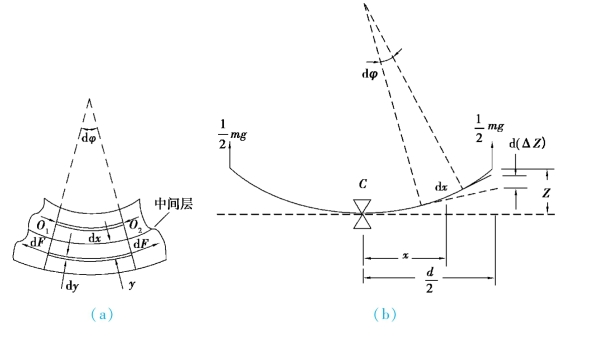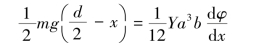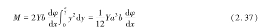 如图2.23(a)所示,在相距dx 的O1O2 二点上的横断面,在金属板弯曲前互相平行,弯曲后则成一小角。 显然,在金属板弯曲后,其下半部呈现拉伸状态,上半部为压缩状态,而在金属板的中间的一薄层虽弯曲但长度不变,称为中间层。 假设与中间层相距为y、厚dy、形变前长为dx 的一段,弯曲后伸长了ydφ,受到的拉力为dF,那么整个横断面的转矩应是