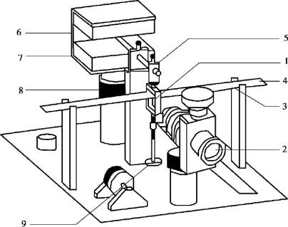 5—铜杠杆(顶端装有霍尔传感器);6—磁铁盒;7—磁铁(N 极相对位置);8—三维调节架;9—砝码。