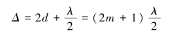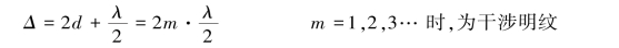 根据干涉条件,当光程差为波长的整数倍时相互加强,出现亮纹;为半波长的奇数倍时互相减弱,出现暗纹。