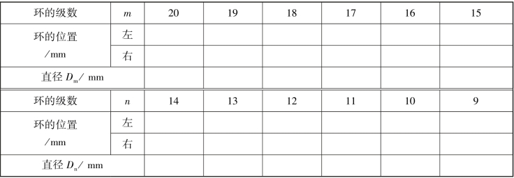 ④转动读数鼓轮,观察十字准线从中央缓慢向左(或向右)移至23 环,然后反方向至第20环向右移动,当十字准线竖线与20 环中心相切时,记录读数显微镜上的位置读数,然后继续转动鼓轮,使竖线依次与19、18、17 等环中心相切,并记录读数于表3.1 中。