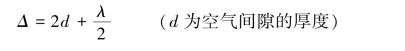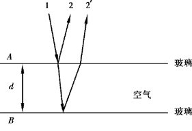 如图3.1 所示,玻璃板A 和玻璃板B 二者叠放起来,中间加有一层空气(即形成了空气劈尖)。 设光线1 垂直入射到厚度为d 的空气薄膜上。 入射光线在A 板下表面和B 板上表面分别产生反射光线2 和2′,二者在A 板上方相遇,由于两束光线都是由光线1 分出来的(分振幅法),故频率相同、相位差恒定(与该处空气厚度d 有关)、振动方向相同,因而会产生干涉。 我们现在考虑光线2 和2′的光程差与空气薄膜厚度的关系。 显然光线2′比光线2 多传播了一段距离2d。 此外,由于反射光线2′是由光密介质(玻璃)向光疏介质(空气)反射,会产生半波损失。 故总的光程差还应加上半个波长λ/2,即