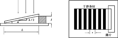 用α 表示劈尖形空气隙的夹角、s 表示相邻两暗纹间的距离、L 表示劈间的长度,则有