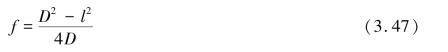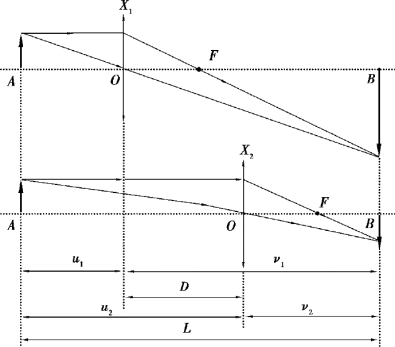 如图3.21 所示,如果物屏与像屏的相对位置D 保持不变,而且D>4f,那么在物屏到像屏之间移动透镜,可以得到两次成像。 由透镜的成像公式可以写出这两次成像的公式: