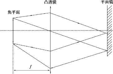 将物屏置于透镜的焦平面上,发出的光经过凸透镜后成为平行光,在透镜后放置一面平面镜,使其与主光轴垂直。 平行光射向平面镜并沿原路反射回来,仍会聚在焦平面上,形成一个倒立等大的像。 此时物屏至透镜光心的距离就是焦距,如图3.22 所示。