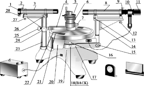 1—狭缝装置;2—狭缝装置锁紧螺旋;3—平行光管部件;4—制动架Ⅱ;5—载物平台;6—载物台调平螺旋(3 只);7—载物台锁紧螺旋;8—望远镜部件;9—目镜锁紧螺旋;10—阿贝式自准直目镜;11—目镜视度调节手轮;12—望远镜光轴高低调节螺旋;13—远镜光轴水平调节螺旋;14—支臂;15—望远镜微调螺旋;16—转座与度盘止动螺旋;17—望远镜止动螺旋;18—制动架Ⅰ;19—底座;20—转座;21—度盘;22—游标盘;23—立柱;24—游标刻度盘微调螺旋;25—游标盘止动螺旋;26—平行光管轴水平调节螺旋;27—平行光管光轴高低调节螺旋;28—狭缝宽度调节手轮