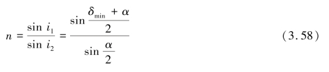 对于给定的棱镜,α 是固定的,δ 随i1 和i4 而变化。 在实验中可以观察到,当i1 变化时,δ有一极小值δmin,δmin 称为最小偏向角。 入射角满足什么条件时,δ 处于极值呢? 令,则由式(3.53)得