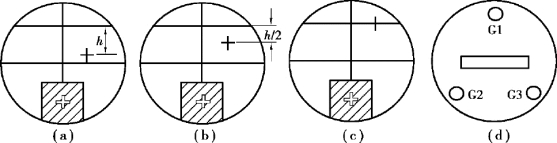 ②用“各半”调节法使绿“十”字反射像位于上叉丝横线。 设其中一个反射像与上叉丝横线距离为h,调节载物平台下螺旋G2 或G3,使h 减小为h/2 ,如图3.31(b)所示,再调望远镜的俯仰角度,使绿“十”字反射像位于上叉丝横线,如图3.31(c)所示。