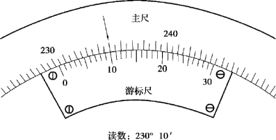 读数装置由刻度盘和游标盘组成,读数方法与游标卡尺类似,如图3.27 所示,刻度盘上每一小格的值为0.5°(30′),游标盘上每一小格的值为1′。