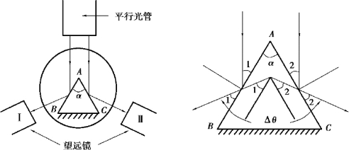三棱镜放在载物平台上,平行光管射出的平行光经棱镜的AB、AC 面反射后,分别射向位置Ⅰ和位置Ⅱ处的望远镜,如图3.33 所示。