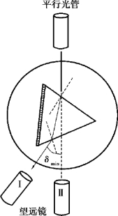 ③旋转平台与望远镜,使棱镜的底边和望远镜都在观察者的右方。 按照上述方法再次测量最小偏向角。