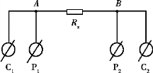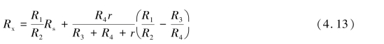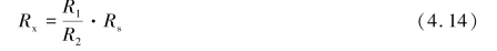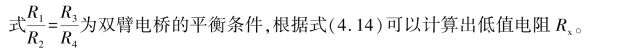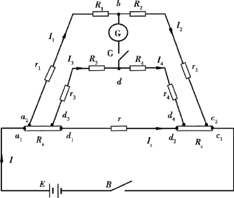 其中由a、c 点到电源和由b、d 点到检流计的导线电阻可并入电源和检流计的内阻里,对测量结果没有影响。 但臂路中的8 根导线和4 个接点的电阻会对测量结果产生影响。 由于比率臂R1 和R2 可用阻值较高的电阻,因此和这两个电阻相连的4 根导线的电阻不会对测量结果带来多大影响,可以忽略不计。 如果待测电阻Rx 是一个低值电阻,那比较臂Rs 也应该是低值电阻,因此和Rx、Rs 相连的导线及接点电阻就会对测量结果产生影响。