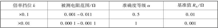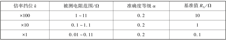 QJ44 型直流双臂电桥是测量0.000 1 ~11 Ω 电阻的双臂电桥,全量程由5 个量限和步进读数盘及滑线读数盘组成。 电桥的标称使用温度为(20±15)℃,标称使用相对湿度为25% ~80%。 直流双臂电桥基本参数见表4.3。