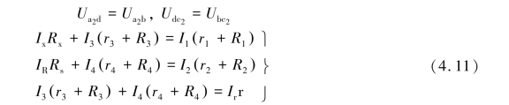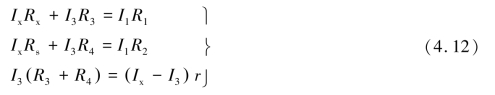 由电路分析可知:r1<<R1;r2 <<R2;r3 <<R3;r4 <<R4,当IG=0,则回路中电流I1 =I2,I3 =I4,Ix=Ir+I3,IR=Ir+I4,IR=Ix,整理以上方程得