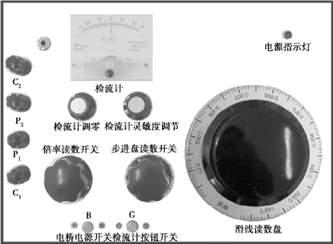 QJ44 型直流双臂电桥箱(如图4.8 所示,C1、C2 是被测电阻电流端接线柱,P1、P2 是被测电阻电位端接线柱);待测金属棒样品(做成四端电阻);电源、导线;千分尺、直尺等。
