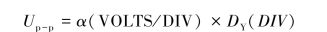 把待测信号输入示波器的Y 轴输入端,将Y 轴输入耦合方式选择键“AC”键按下,Y 轴垂直偏转因数旋钮“VOLTS/DIV”旋到适当位置,调节有关控制开关及旋钮使显示波形稳定,读取所显示波形波峰与波谷之间的垂直距离所占格数值DY(DIV),读取信号输入通道垂直偏转因数旋钮的挡位数α,如图4.14 所示,则
