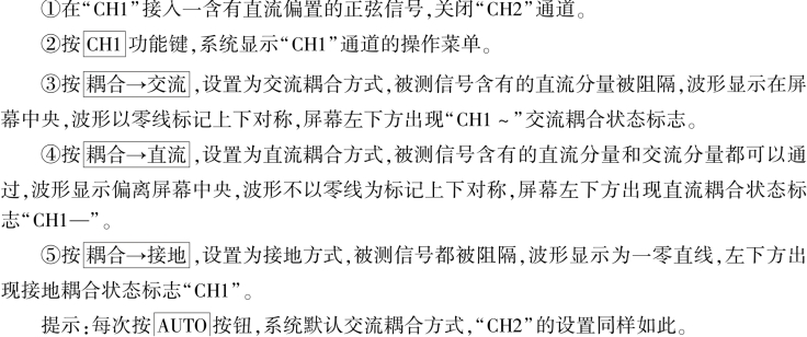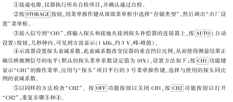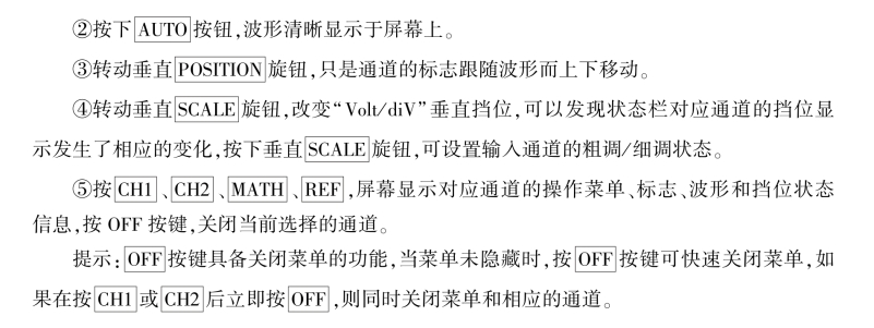 上述为示波器的基本操作步骤。 CH2 的单通道操作方法与CH1 类似,进一步的操作方法在下面内容中逐一学习。