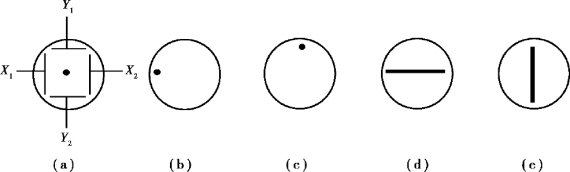 偏转系统由两对相互垂直的极板X1X2(水平X)和Y1Y2(竖直Y)构成,当两对偏转极板上均不加电压时,电子束穿过极板间时不发生偏转,光点在荧光屏的中央,如图4.11(a)所示;当在X1X2 极板上加直流电压(设UX1>UX2)时,电子束穿过X1、X2 两极板时向左偏转,屏上光点向左移动,如图4.11(b)所示;当在Y1Y2 极板上加直流电压(设UY1 >UY2)时,则电子束穿过Y1、Y2 两板间时向上偏转,屏上光点向上移动,如图4.11(c)所示;当在X1X2(或Y1Y2)极板上加交变电压时,则电子束穿过偏转极板间时将水平(或上下)周期运动,即屏上光点水平(或上下)振动,如振动较快,即屏上出现一条水平(或竖直)亮度线,如图4.11(d)(e)所示。