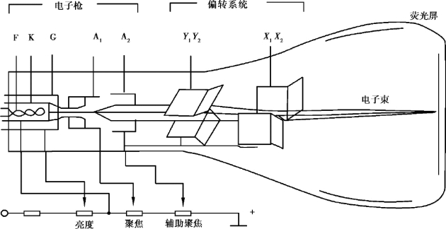 示波管是示波器进行图形显示的核心部分,在一个抽成高真空的玻璃管中,装有各种电极,如图4.10 所示,按其功能可分为3 部分。