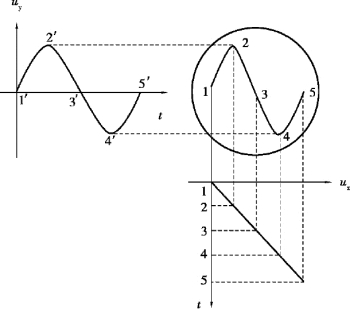 若将随时间作正弦变化的电压信号uy=Uysin ωt 加在Y 偏转板上,荧光屏上显示出一条垂直亮度线,看不到正弦曲线。 在上述条件下,若同时再在X 偏转板上加入一个与时间成正比的线性电压ux=K·t,则电子束在竖直方向上作简谐振动的同时,还在水平方向上作自左向右的匀速运动,这样就能在荧光屏上显示出信号电压uy 和时间t 的正弦变化曲线,其原理如图4.12 所示。
